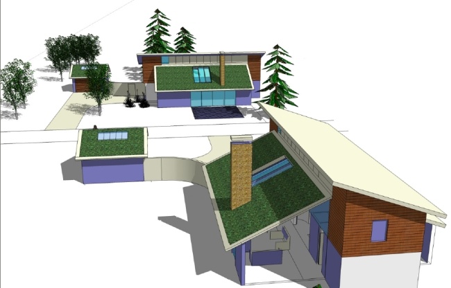 The houses have been designed as sustainable, green homes with high levels of thermal insulation to reduce the energy required to heat the houses. Generously sized windows exploit passive solar gain. Large roof overhangs provide shade to the panoramic living room windows and help prevent summer over-heating. The houses will be constructed using a timber-framed structure, “super-insulated” with recycled cellulose material.
