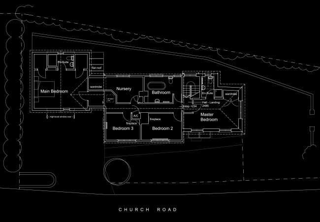 The new extension provides a family room on the ground floor, accessed down two steps from the existing living room. A single garage is formed at the far end of this extension. A new master bedroom with en-suite and built-in wardrobes has been created on the upper floor with open-vaulted ceiling and low level eaves.