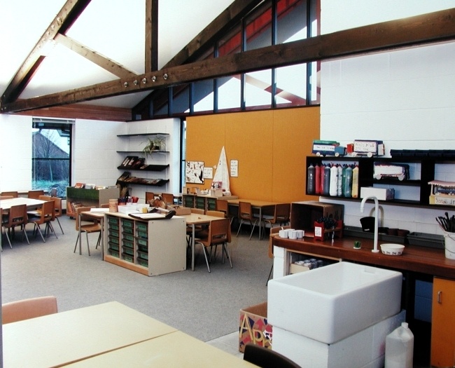 The linear plan form of the building enabled a simple and elegant structural system to be used with exposed, wide span, bolted timber trusses. Uplighters are located within the cords of the trusses to provide a good uniform level of light across the classrooms without cluttering the open vaulted ceilings.
