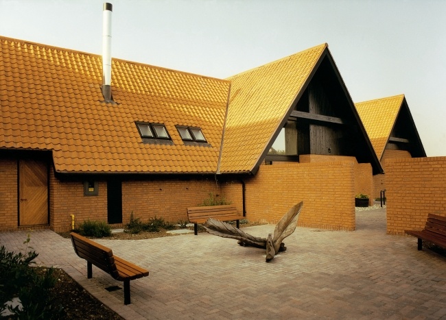 The site for this new primary school enjoys spectacular views over Mersea Island and the Blackwater Estuary.> The steep pitched roofs with their low eaves impart a warm and friendly scale to the primary school and help to integrate the building into the fabric of the village. Roofs are clad in clay pantiles and walls in brickwork with stained weather boarded gables. Roof volumes are expressed internally with high-level ceilings and natural timber boarding for improved acoustics and good air quality.