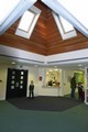 The new design gives a strong identity to the main entrance and provides a welcoming space for visitors. The main reception is housed under an open-vaulted pyramid roof, clad in natural slate and finished internally in Douglas Fir acoustic slats. Rooflights provide generous levels of natural light and ventilation deep into this central area.