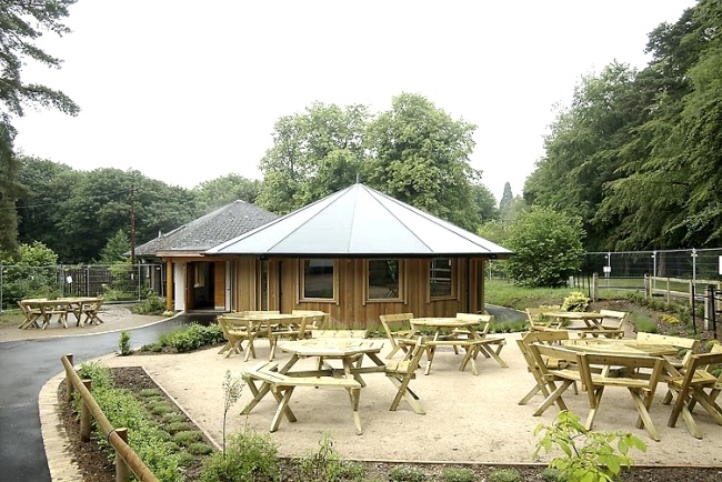 Other parts of the existing building were refurbished with a new meeting room created on a mezzanine level. An outdoor sitting area allows visitors to enjoy refreshments, with views overlooking the forest and adjacent walled garden.